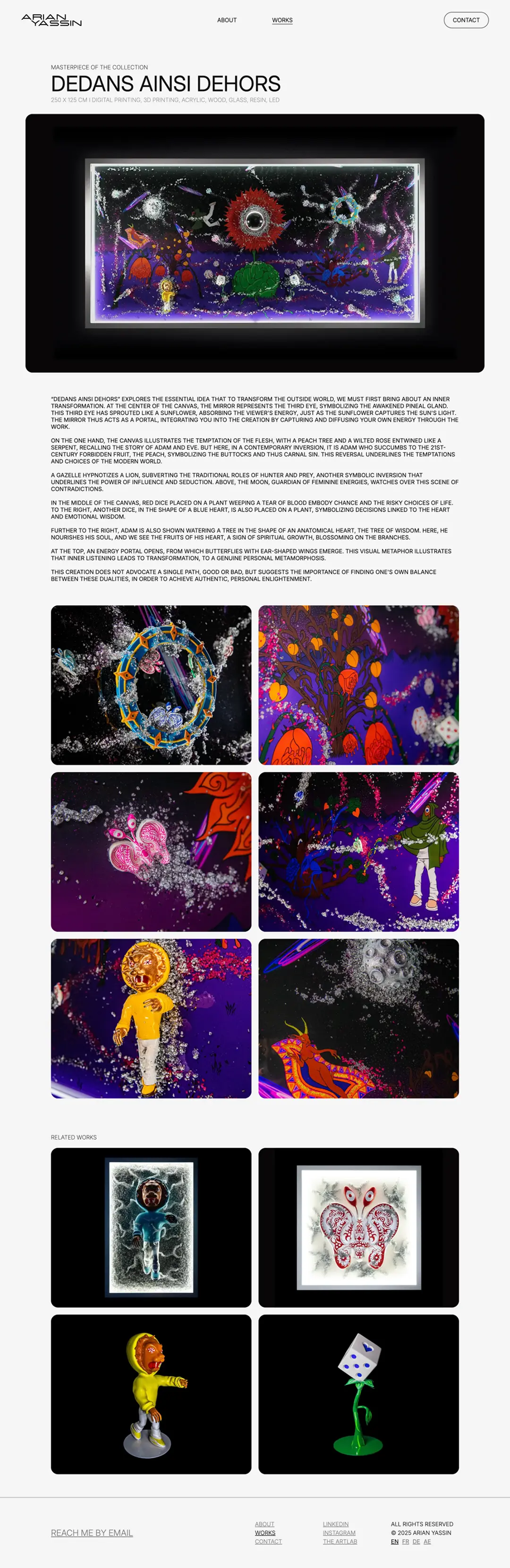 ContexteConception et développement d’un portfolio multi-lingue sous la forme d’une interface web destinée à valoriser et exposer les œuvres de l’artiste.ObjectifProposer une expérience 2D et 3D à la fois fluide et immersive, tout en assurant performance, évolutivité et maintenabilité du code.