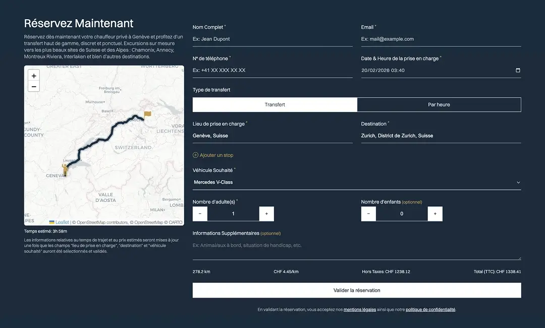 ContexteDéveloppement d’une interface dédiée à la réservation de transferts privés en véhicule.La plateforme comprend une interface publique accessible à tous, ainsi qu’un espace privé permettant au propriétaire et à ses partenaires d’accéder directement aux réservations et d’anticiper l’organisation des trajets pour leurs clients.